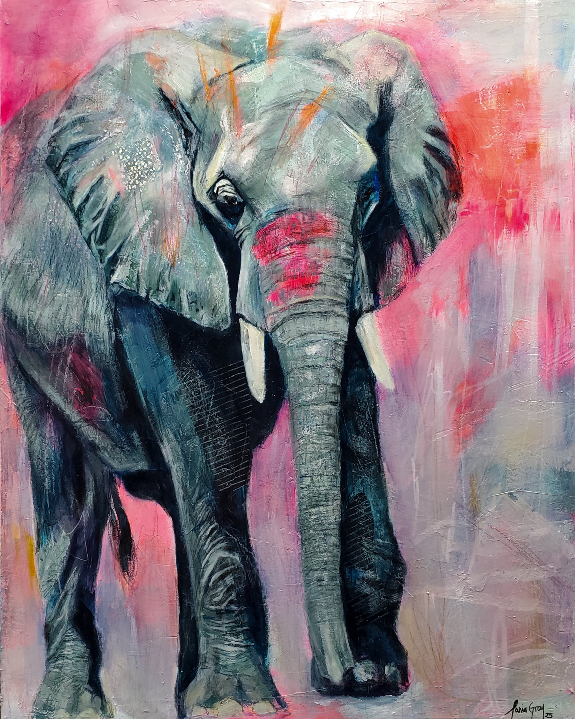 Unleash your inner creative force with this dynamic piece! Featuring an elephant in motion, it's abstract realism style and mixed media technique is created using interesting collage and texture. Bold colors and intricate details make this piece truly unique. Take a risk and add a touch of adventure to your space!