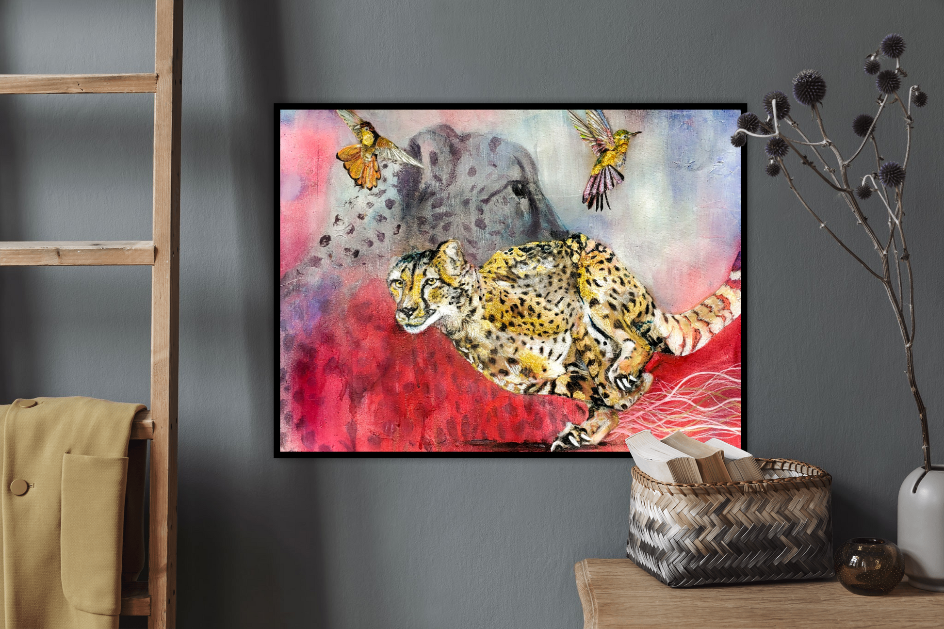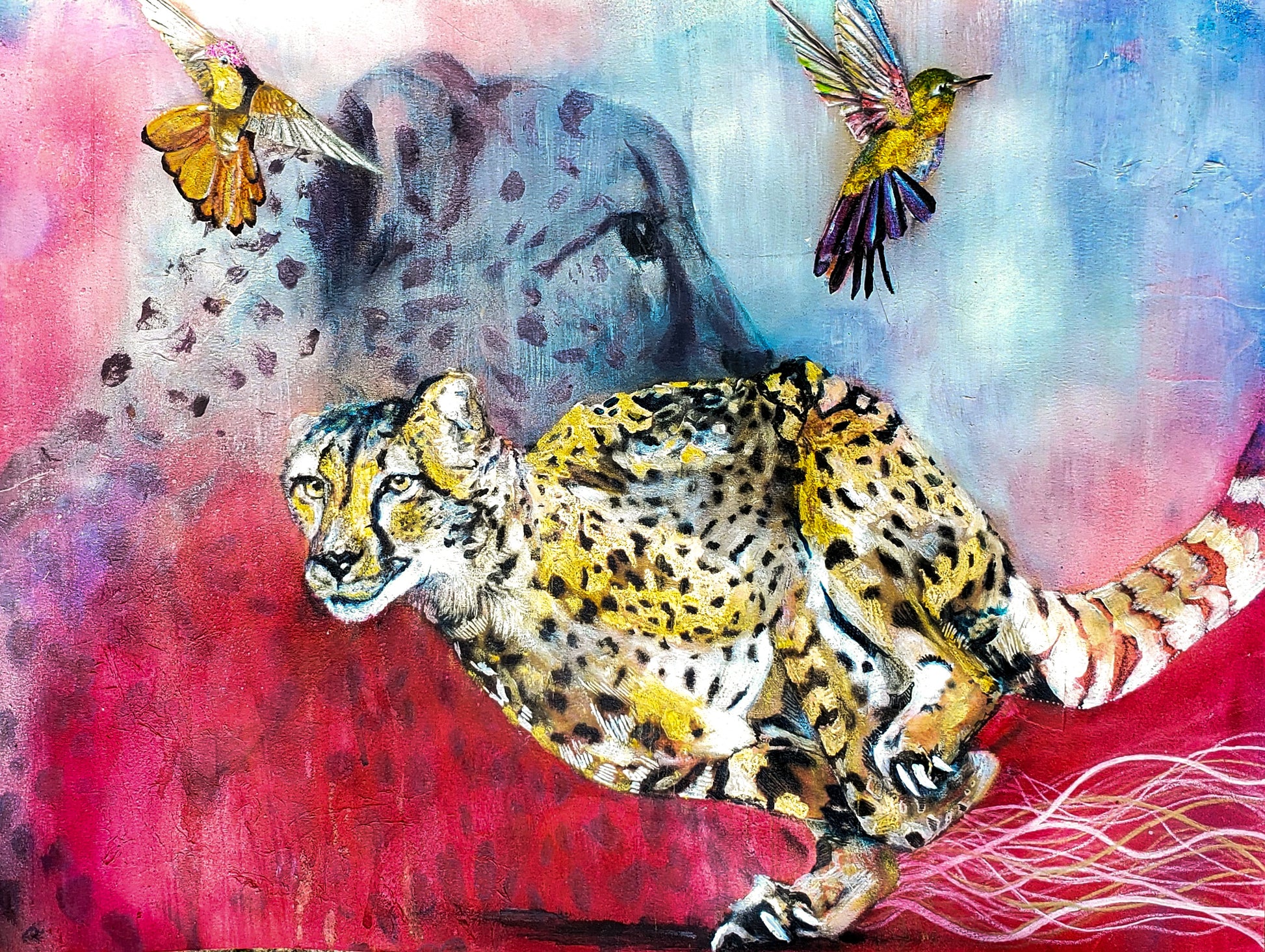 I had a daydream about this painting. It speaks to me of how glorious creation is In my dream there was a faded almost heavenly image of a cheetah, with a cheetah running full speed in front of it. I think the faded one is a memory or a watcher, and the one in front is showing off it's skill. I also saw some hummingbirds flitting around having fun in the sky above. Each of these creatures has a specific purpose and was created with an extraordinary design. This is beauty, this is beautiful creation, they are doing what they are meant to do. Hummingbirds are iridescent jewel of the sky.