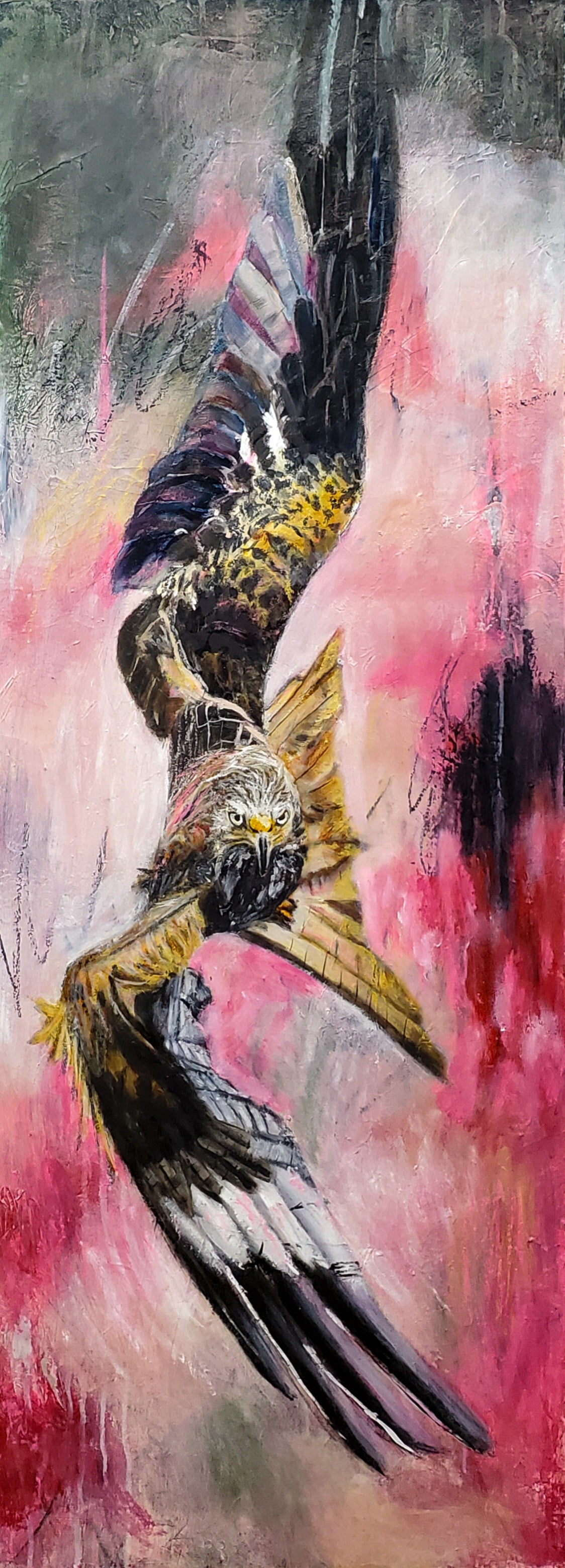Take flight with the majestic white tailed Kite hawk, with an intense gaze, it is a moment frozen in time in awe-inspiring feats of flight. it is painted in an abstract realism style. Interesting collage and textures bring to life a powerful hawk flying in a bold stormy sky, painted in reds, pinks, and dark greens. "I Believe I Can Fly" will inspire you to embrace challenges and reach new heights!