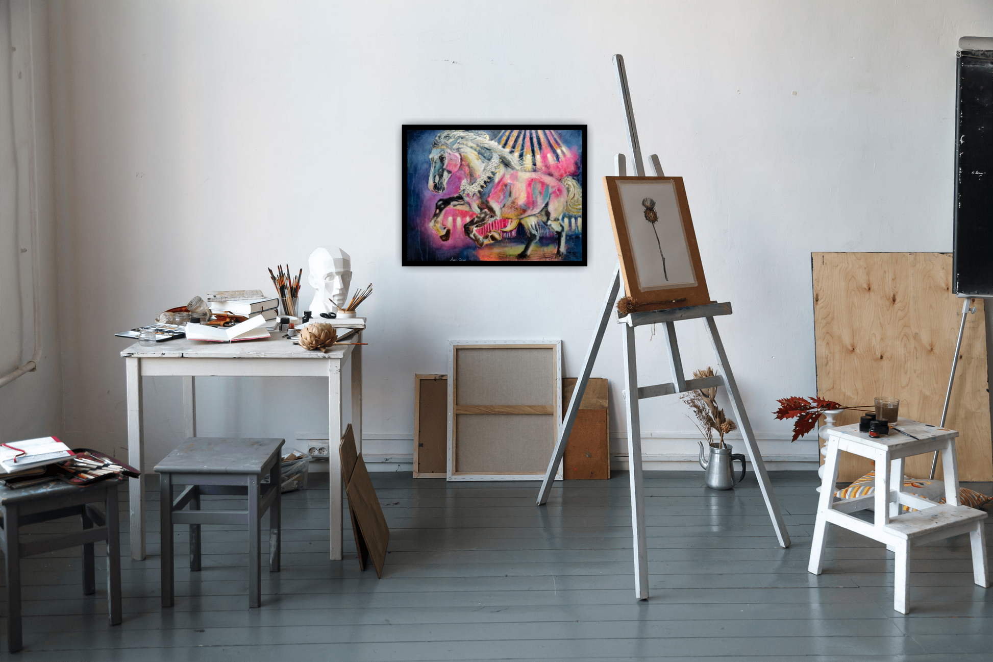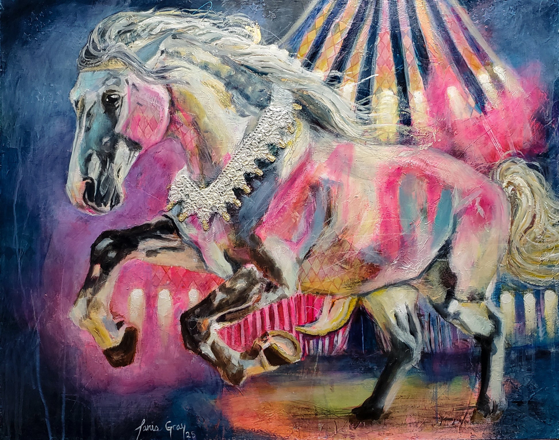Where the Wild Runs Bright captures a bold blend of mixed media and abstract realism, showcasing a carousel horse breaking free under the cloak of night. This dynamic painting evokes a powerful sense of escape and untamed freedom, perfect for those drawn to bold stories and fearless imagination. The vivid movement and moody atmosphere invite you to celebrate the wild spirit that refuses to be confined.